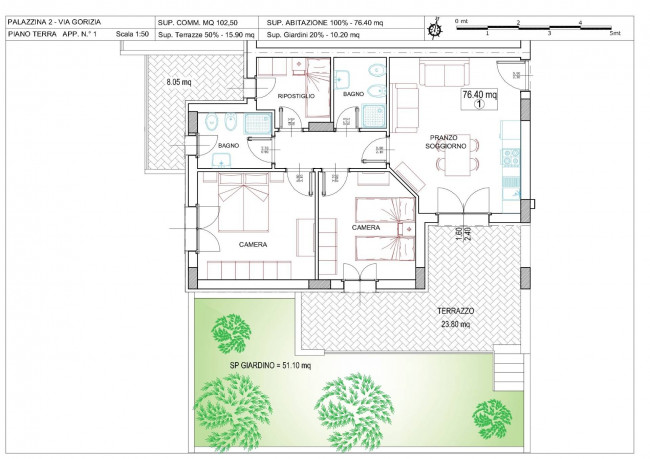 Internamente gli spazi sono così organizzati: ingresso su zona giorno con angolo cottura, disimpegno, una camera da letto matrimoniale, una camera doppia ed una cameretta. I bagni sono due, entrambi dotati di box doccia. Punto forte sono sicuramente gli esterni: collegati alla zona giorno un bellissimo terrazzo coperto di 24 mq e un giardino privato di 50 mq. Presente un secondo terrazzo nella zona notte. Esposizione sud ovest: ambienti luminosi tutto il giorno, tutto l'anno.