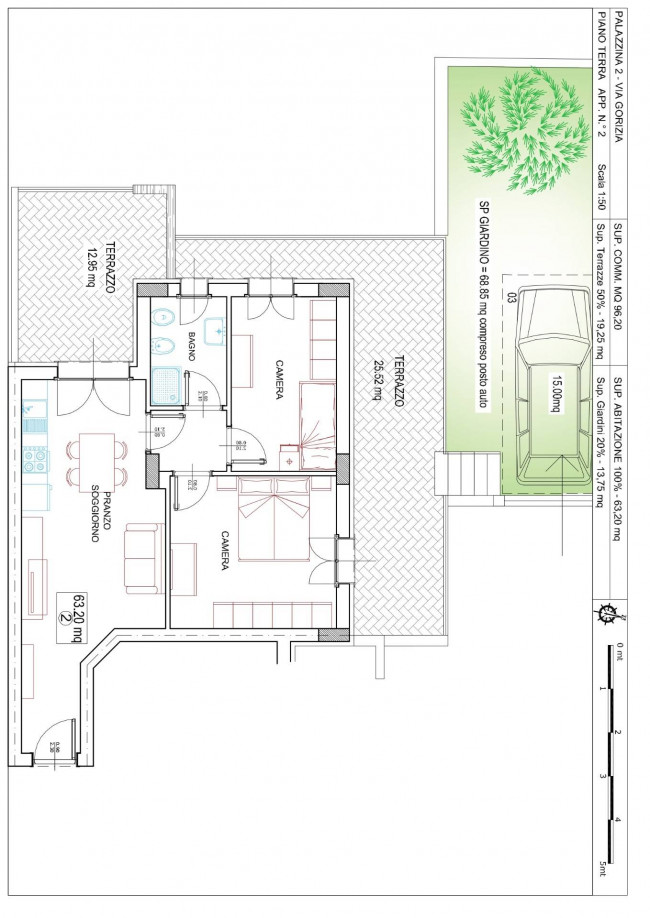 Internamente gli spazi sono così organizzati: ingresso su zona giorno con angolo cottura, disimpegno, una camera da letto matrimoniale, una camera doppia ed un bagno. Punto forte sono sicuramente gli esterni: collegato alla zona giorno un bellissimo terrazzo coperto di 13 mq, un secondo terrazzo di 25 mq nella zona notte e un giardino privato di 70mq con annessa area per il parcheggio dell'auto. Esposizione nord ovest.