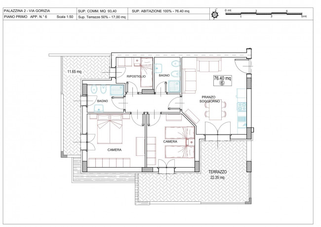 Internamente gli spazi sono così organizzati: ingresso su spaziosa zona giorno con angolo cottura a vista ma separato dalla zona living, disimpegno, due camere da letto matrimoniali, una camera singola e due bagni, entrambi con doccia. La zona giorno ha accesso ad un bellissimo terrazzo coperto di oltre 20 mq, mentre la zona notte dispone di un comodo balcone di 11 mq.