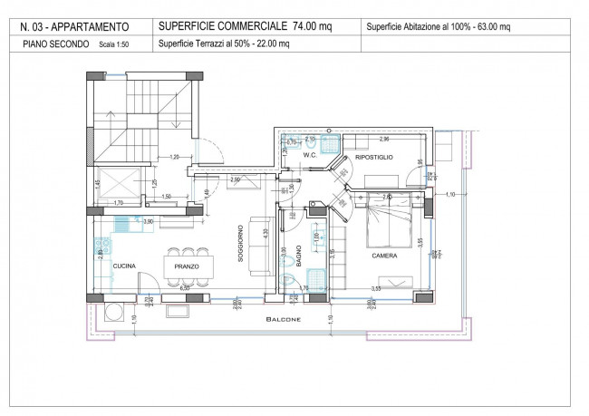 Esternamente dispone di un balcone perimetrale per una superficie totale di 22 mq.